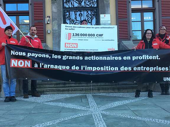 Pour illustrer de manière concrète la baisse de rentrées fiscales pour le Valais, Unia a déposé ce matin sur les marches du Palais du Gouvernement cantonal un chèque géant de 136 millions émis au nom des contribuables valaisans.