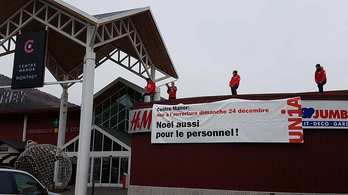 Entre 11h30 et 12h30, pour sensibiliser la clientèle nombreuse à ce moment-là, Unia a déployé sur une façade de la grande surface une imposante banderole de 2 mètres sur 7 portant le slogan " Centre Manor, Non à l'ouverture dimanche 24 décembre. Noël aussi pour le personnel" (cf. photo).
